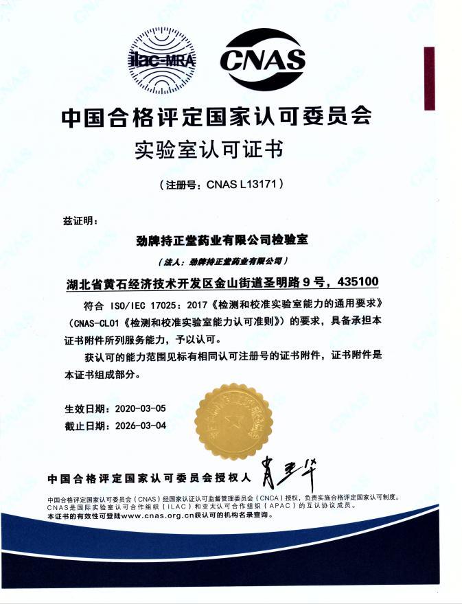 日前,勁牌持正堂藥業(yè)檢驗室獲得由中國合格評定委員會(英文簡稱“CNAS”)授予的實驗室認可證書。這是繼2008年勁牌公司檢測中心首次通過國家CNAS認可(食品領(lǐng)域)以來,勁牌再次通過國家CNAS認可(藥品領(lǐng)域)。